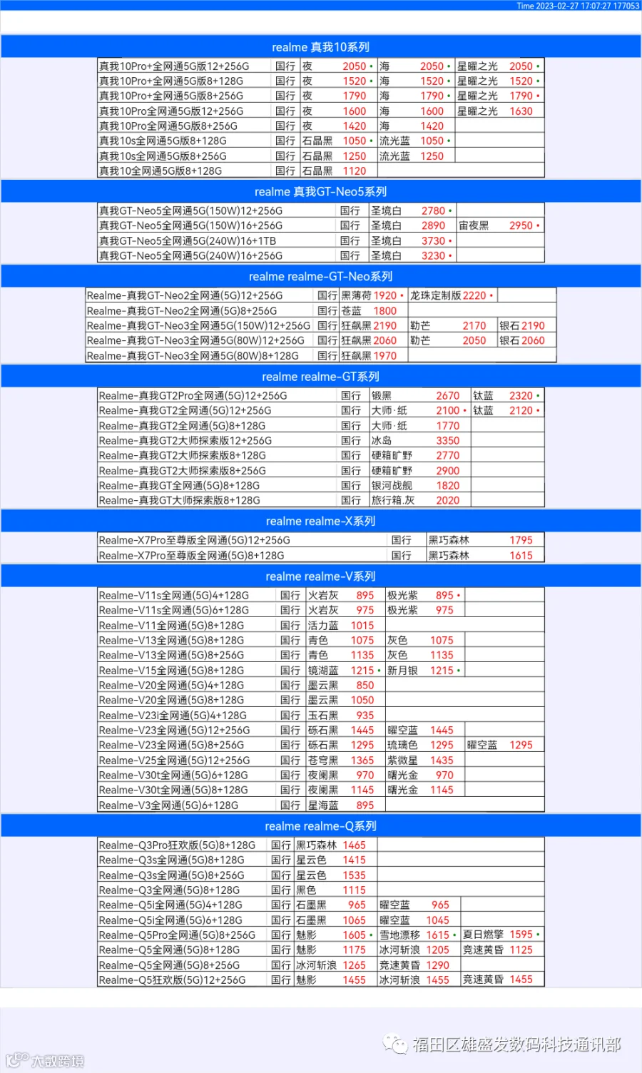 新机报价【2023年2月27日】OPPO VIVO IQOO 一加 真我