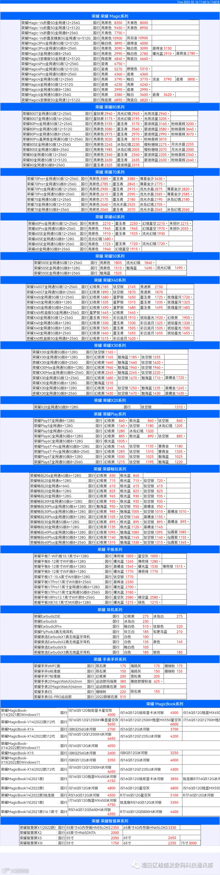 新机报价【2023年2月16日】华为   荣耀 报价 芯烨微 电子科技