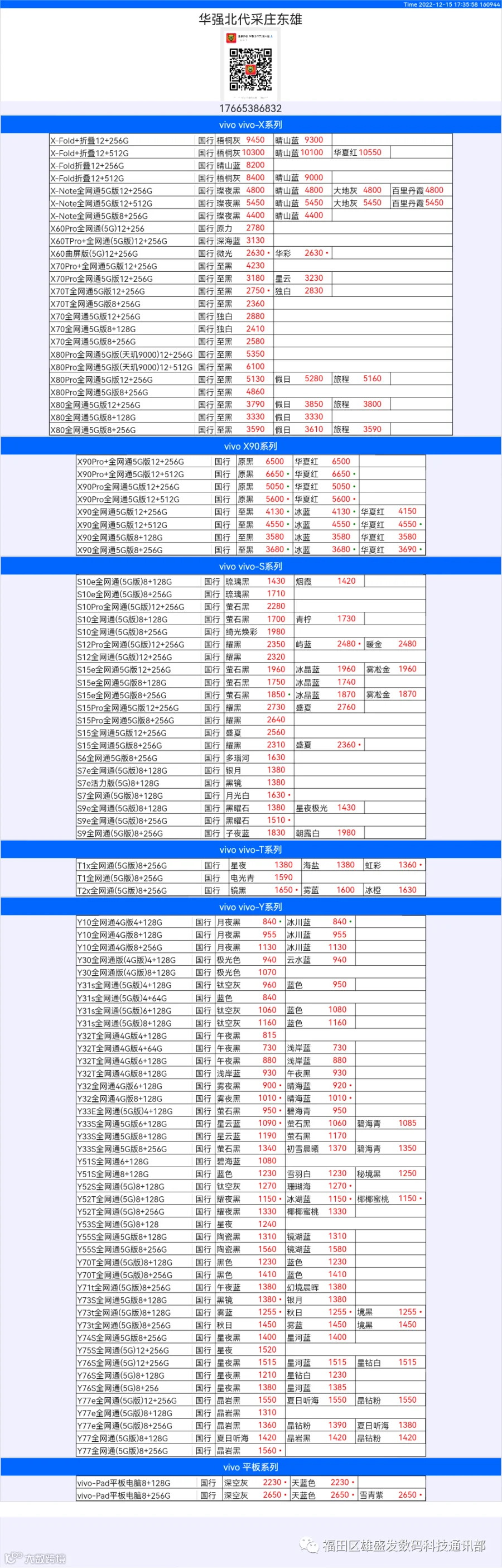 新机报价【2022年12月15日】OPPO   VIVO  IQOO   一加   真我 芯烨微 电子科技