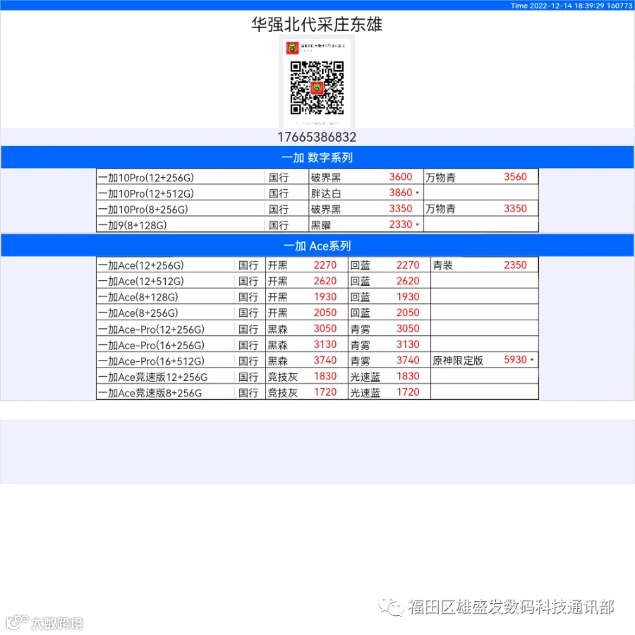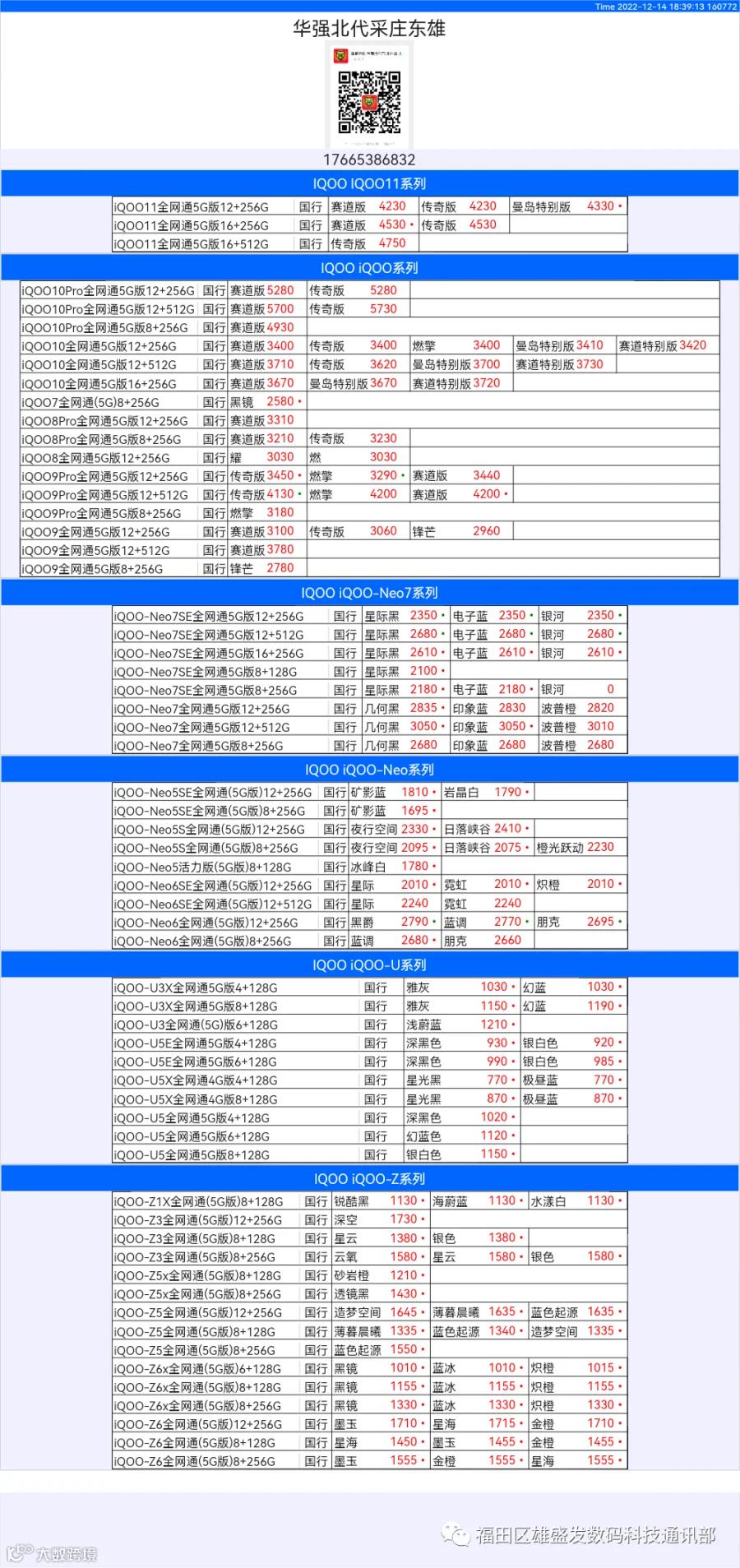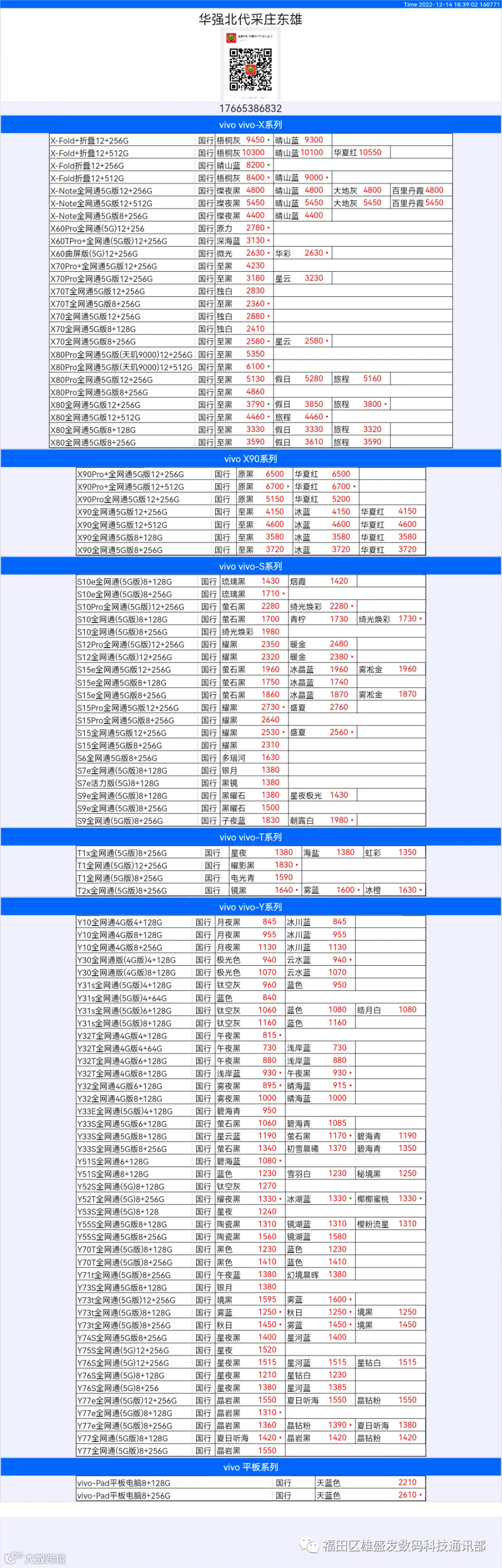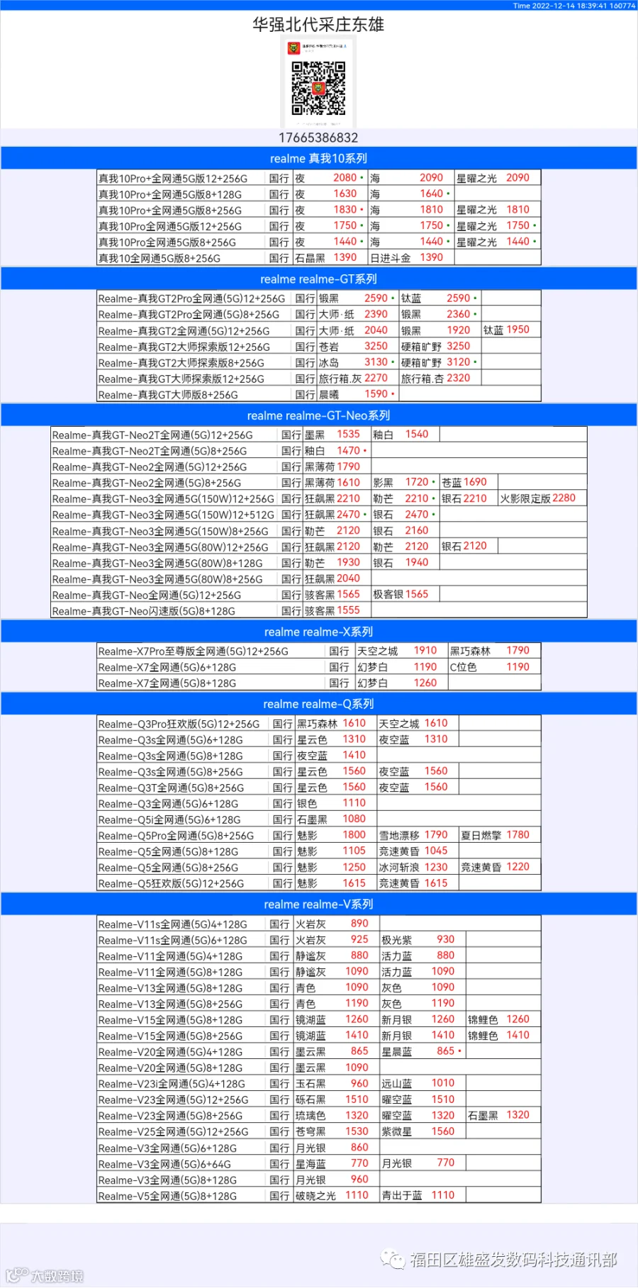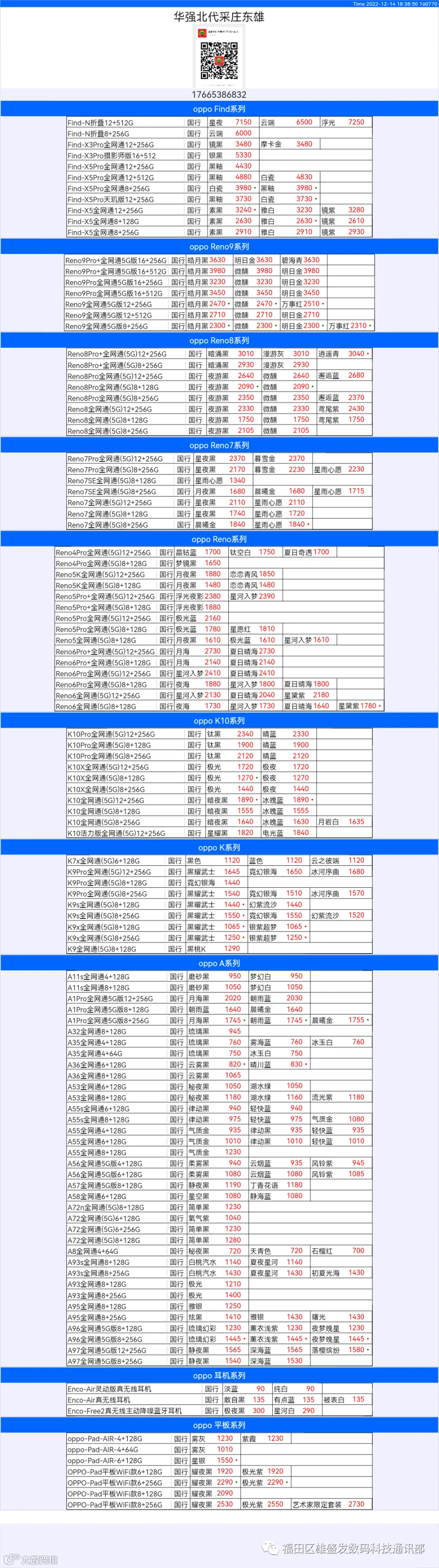 新机报价【2022年12月14日】OPPO   VIVO  IQOO   一加   真我 芯烨微 电子科技