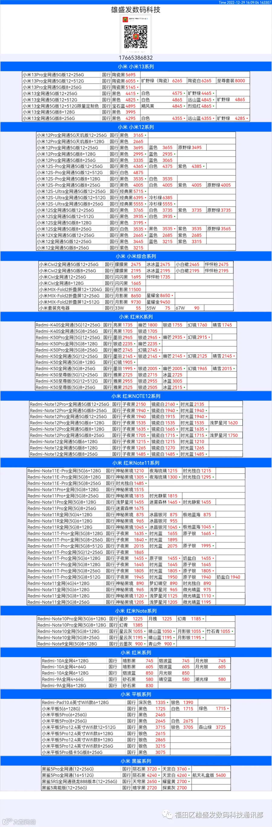 新机报价【2022年12月30日】小米  红米   黑鲨   报价 芯烨微 电子科技