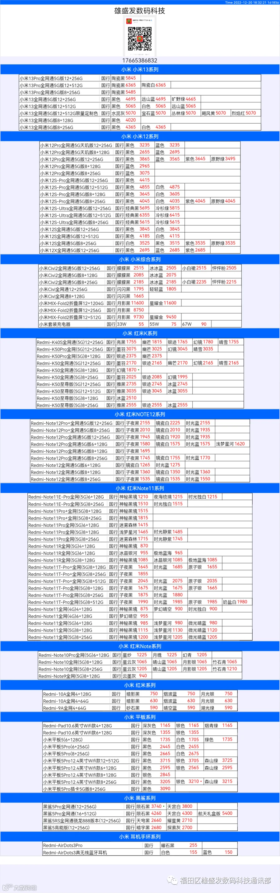 新机报价【2022年12月20日】小米  红米   黑鲨   报价 芯烨微 电子科技