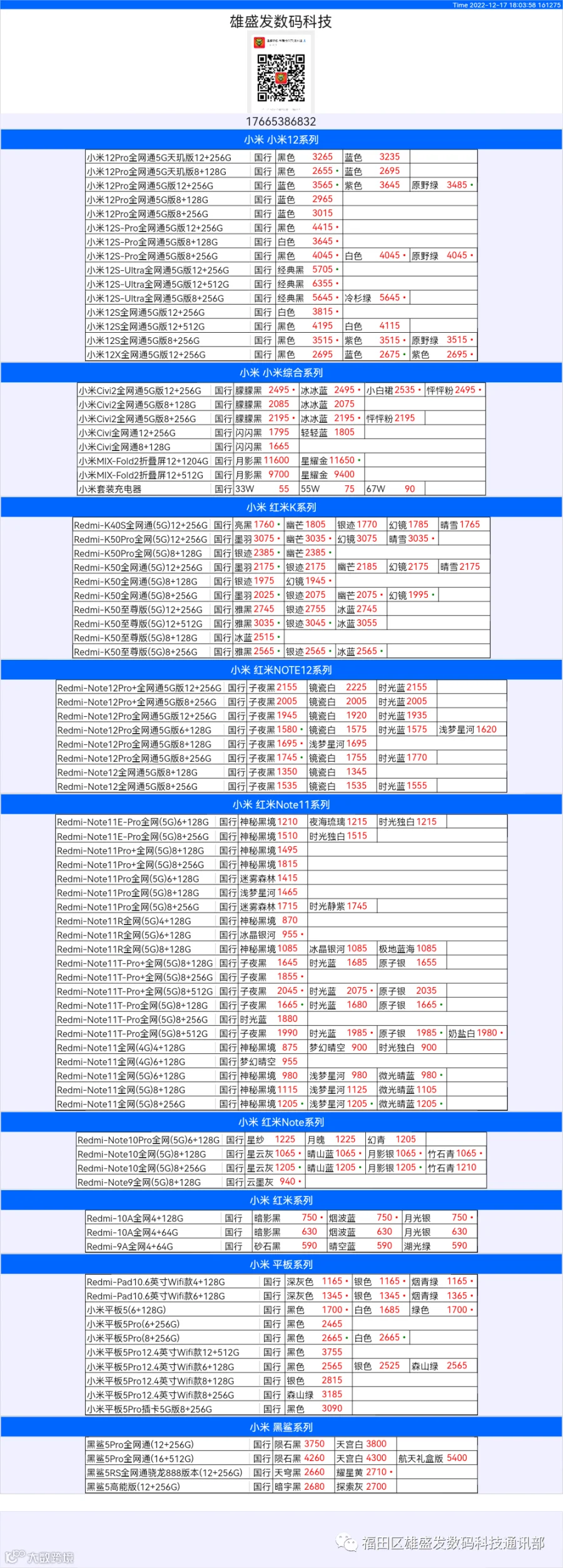 新机报价【2022年12月17日】小米  红米   黑鲨   报价 芯烨微 电子科技
