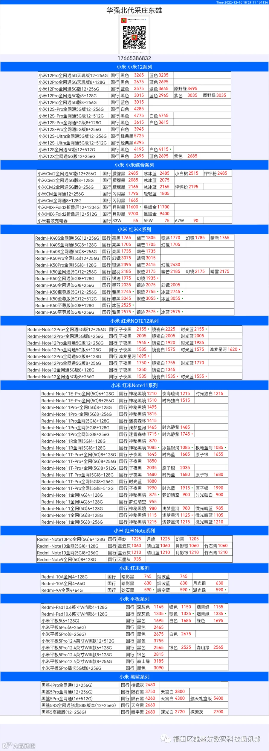 新机报价【2022年12月16日】小米  红米   黑鲨   报价 芯烨微 电子科技