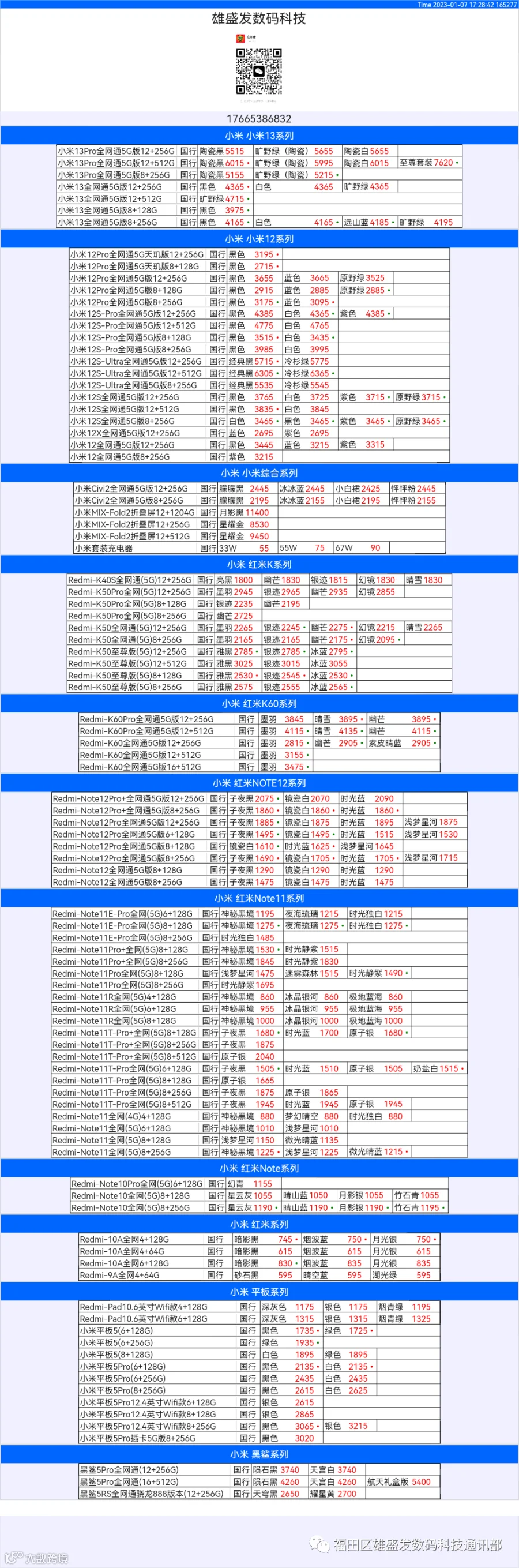 新机报价【2022年1月7日】小米  红米   黑鲨   报价 芯烨微 电子科技