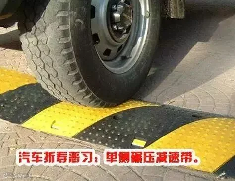 很多司机在通过这样的减速带时喜欢只用一侧的轮子轧过去,认为这样冲击小对车子损害小。