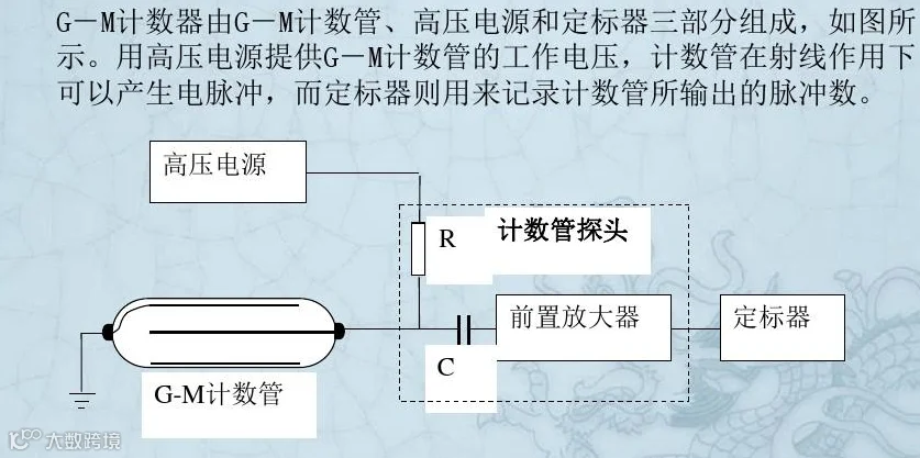 盖革计数器是一种专门探测电离辐射(α粒子、β粒子、γ射线和X射线)强度的记数仪器。由充气的管或小室作探头,当向探头施加的电压达到一定范围时,射线在管内每电离产生一对离子,就能放大产生一个相同大小的电脉冲并被相连的电子装置所记录,由此测量得单位时间内的射线数。