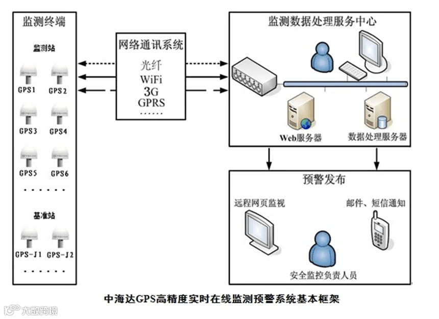 中海达北斗灾害监测系统其实原理很简单,就是在可能发生灾害的滑坡或者崩塌体山建立永久性的监测基站,通过卫星数据的跟踪,得到灾害体的时时三维绝对坐标变化值,灾害体将要发生灾害那么其自身的三维绝对坐标一定会发生看不见的微小变化,但是通过卫星数据却能被发现。再通过后端软件处理平台,通过电子邮件,短信,声光报警器等设备及时对相关负责人员提供报警。这样就能为灾害的发生提前做出防范措施,避免灾害造成的重大人员伤亡和财产损失。