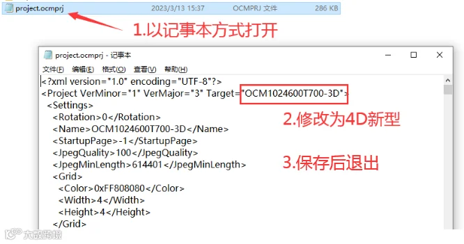 上位机开发软件及工程:4D和3D系列产品是共用上位机开发软件。3D工程可通过修改ocmprj工程文件里的型号(以记事本方式打开ocmprj工程文件,修改里面“Target”型号),重新编译后即可下载到4D系列(不同分辨率时,需要调整控件位置)。4D系列存储容量变小(3D默认是1G bit,4D默认是128M bit)。