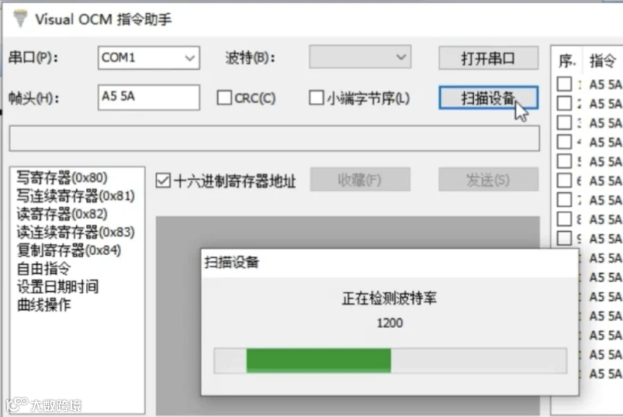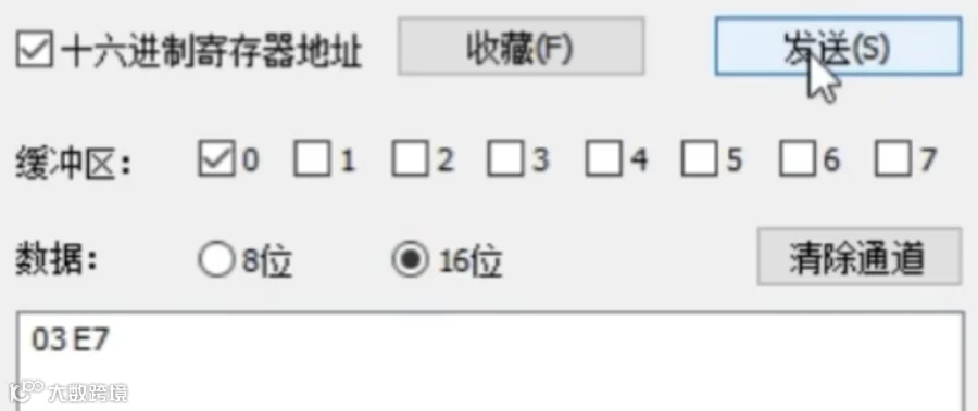 选择曲线操作,数据选择16位,输入03 E8(对应十进制1000)连续发送。