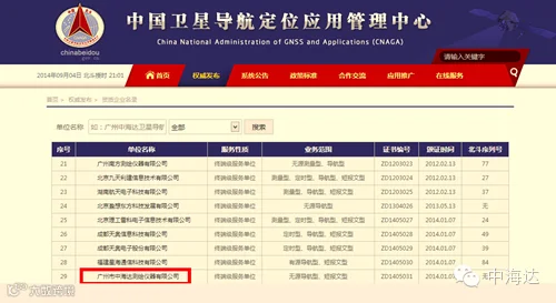 9月2日,中国卫星导航定位应用管理中心在中国北斗应用峰会上发布了《北斗导航民用服务资质单位名录》和《北斗导航产品质量检测机构名录》,包括北斗导航分理级服务正式单位12家、分理级试验单位32家、终端级服务单位44家,国家级北斗导航产品质检中心3家,区域级质检中心7家,广州市中海达测绘仪器有限公司位列其中。