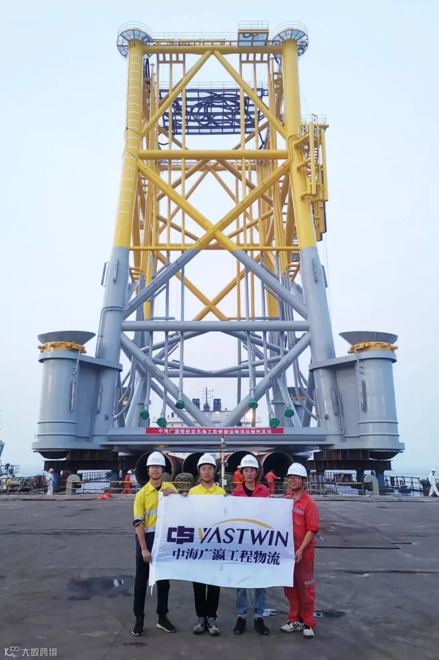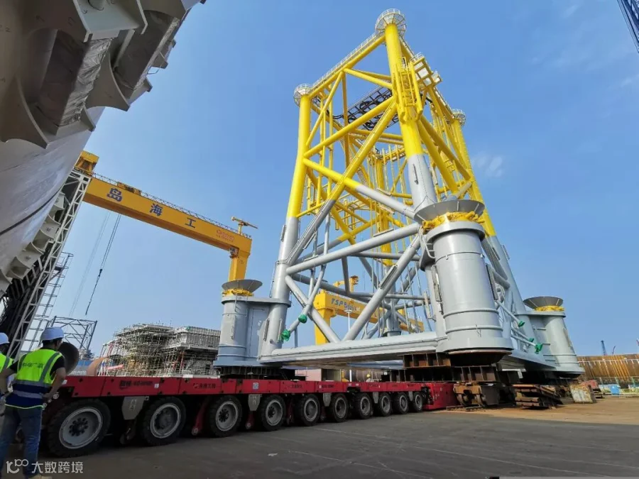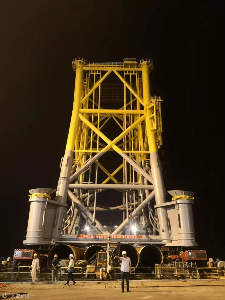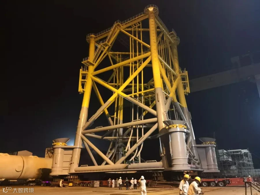 我司此次运输的导管架高约45米,净重1700余吨,加上工装总重达1900吨,是为了满足广东深水海域海上风电项目升压站特制的,也是国内少有的升压站导管架滚装案例。