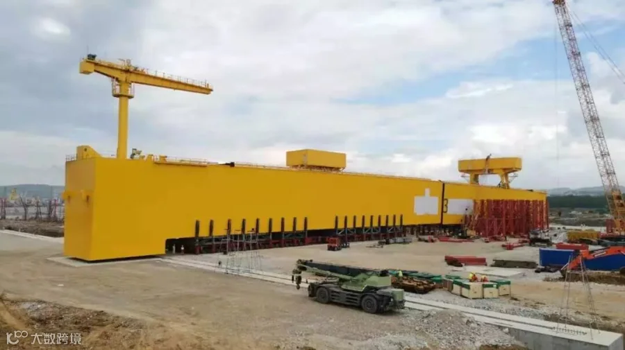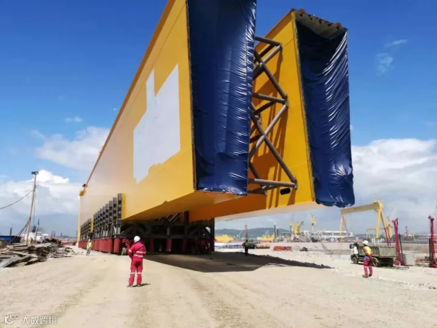 此次运输的1200吨龙门吊从建造场地起始发运,后续海运至俄罗斯指定区域落位合拢。运输行程内包含场内短倒、滚装上船、船-船对滚、滚卸下船、场内转运、顶升合拢几类操作工序。