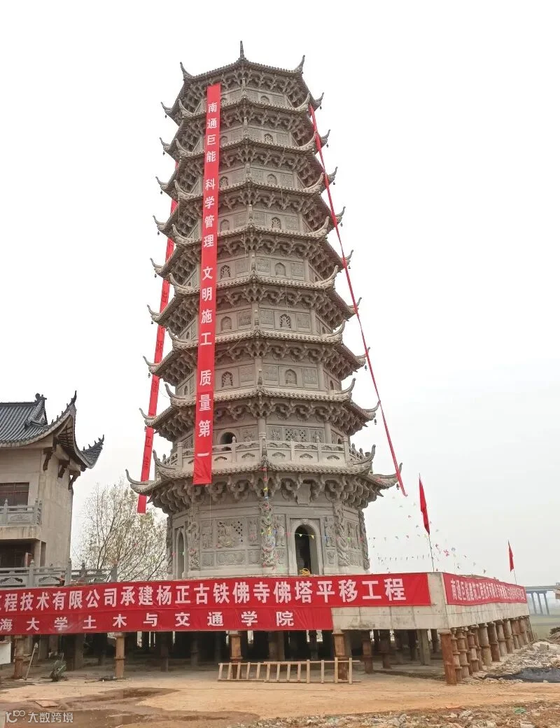 杨正古铁佛寺位于武汉黄花涝镇毗邻黄花村。因施工规划需要将一座大雄宝殿和一座佛塔分别从原址基础位进行自装车,运输至距原址直线距离约为 190 米左右的新址进行落位。