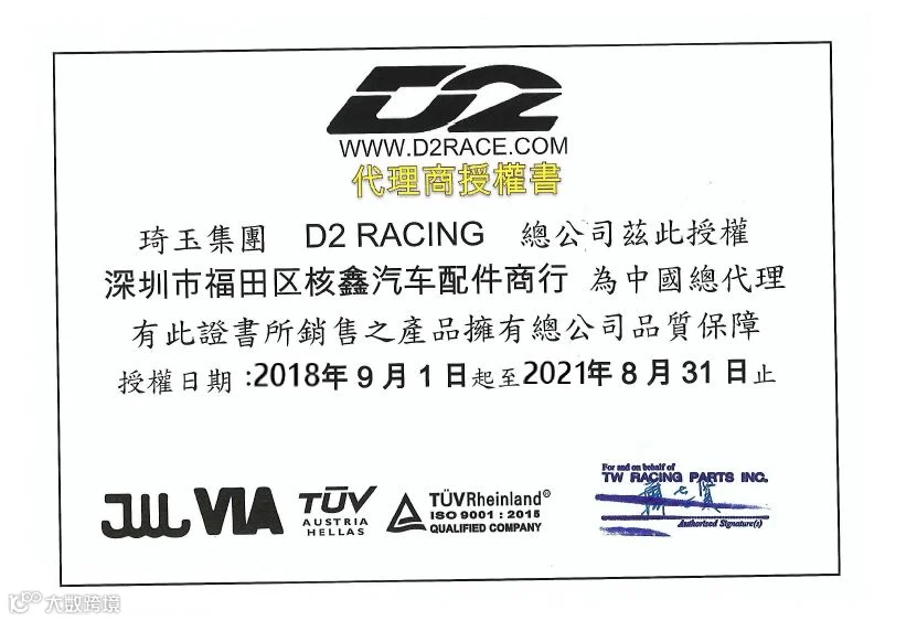 D2是台湾唯一同时拥有FIA,TüV,ARTC,TüV ISO认证的公司。贺 D2车队荣获2010,2011,2012,2013,2014,2015,2016,2017,2018年GT房车赛精英杯总冠军!(破单圈最快纪录)本公司是台湾专业制造高性能避震器、煞车系统、气压零件及铝圈的最大制造厂。到目前为止,D2已经生产3500种车型的避震器、煞车及气压,并且持续研发新的车型。另外本公司在提供国外公司代工品牌服务上更具多年经验。