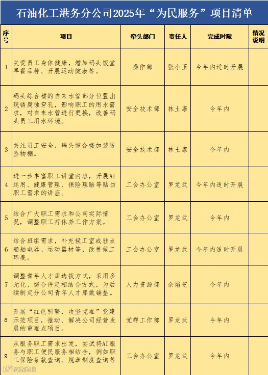 分公司工会多次深入基层调研、广泛征集员工需求制定2025年“为民服务”项目清单(清单内容详见下图)。清单内容涵盖员工住宿环境、工作环境、技能学习、身心健康等多个方面;清单时限全年度贯穿,多项内容完成时限渗透全年,力求把为群众办实事融入日常、做在经常。