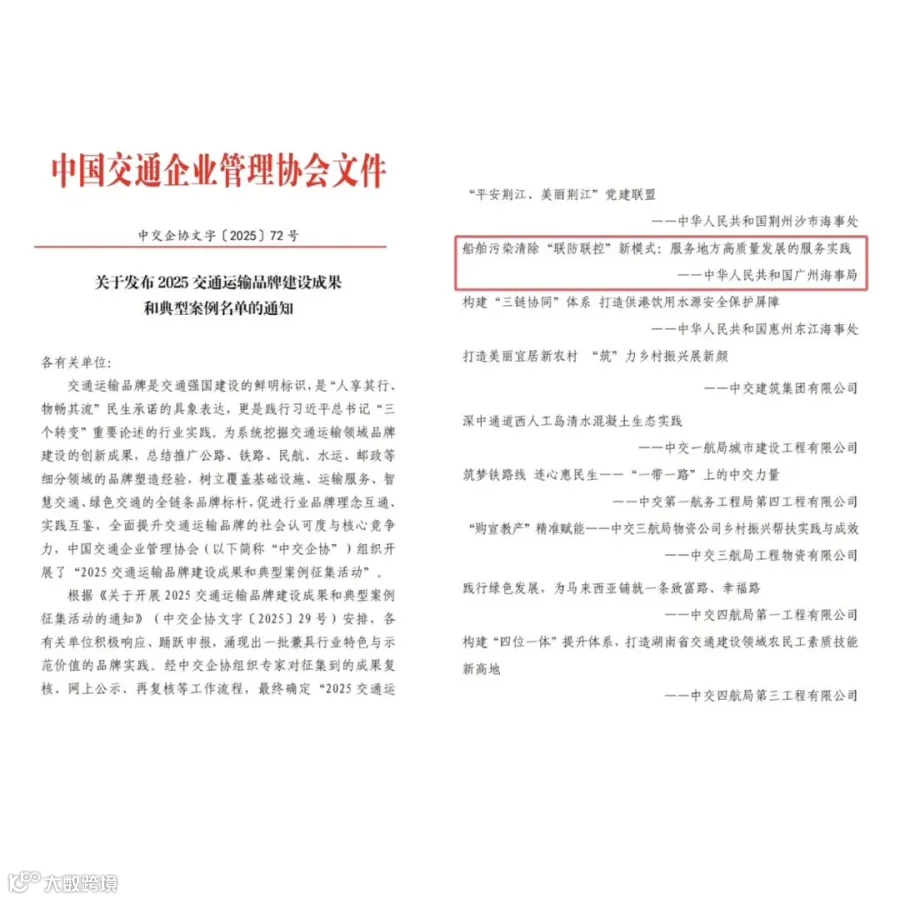 近日,中国交通企业管理协会公布了2025年交通运输品牌建设成果与典型案例名单。由广州海事局牵头,联合广东港航环保科技有限公司等5家单位共同推动的《船舶污染清除“联防联控”新模式:服务地方高质量发展的实践》成功入选典型案例。此次入选,标志着该模式在系统性、创新性和实效性方面获得了国家级层面的认可,也为全国船舶污染防治工作提供了可复制、可推广的“广州港经验”。