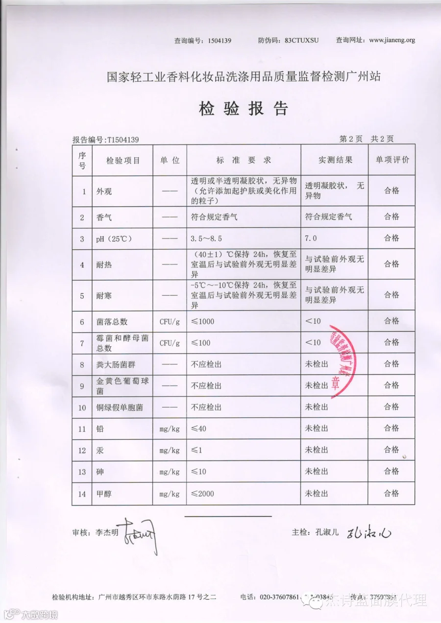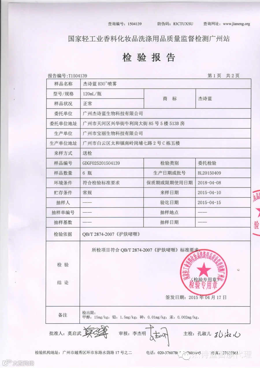 国家轻工业香料化妆品洗涤用品质量监督检测广州站,对送检的随机抽出的杰诗蓝H3O+防晒喷雾,送回一份具有真实性、科学性、公正性、准确性的权威报告,检验报告表明:所有检验项目均为“合格”,无任何问题。