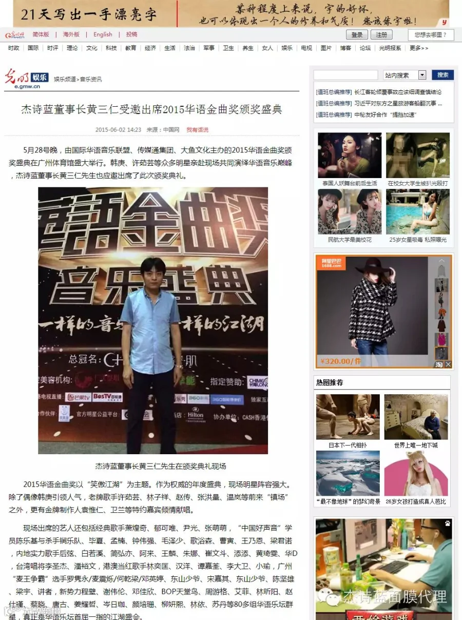 5月28号晚,由国际华语音乐联盟、传媒通集团、大鱼文化主办的2015华语金曲奖颁奖盛典在广州体育馆盛大举行。韩庚、许茹芸、萧煌奇等众多明星亲赴现场共同演绎华语音乐巅峰,杰诗蓝董事长黄三仁先生应邀出席了此次颁奖典礼。