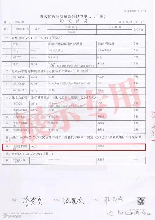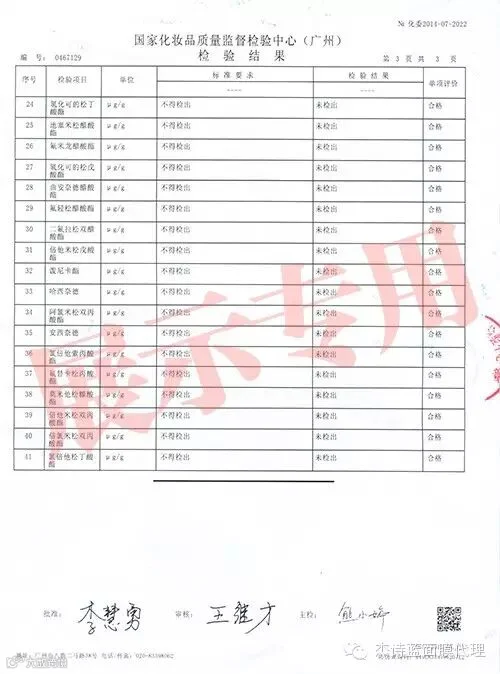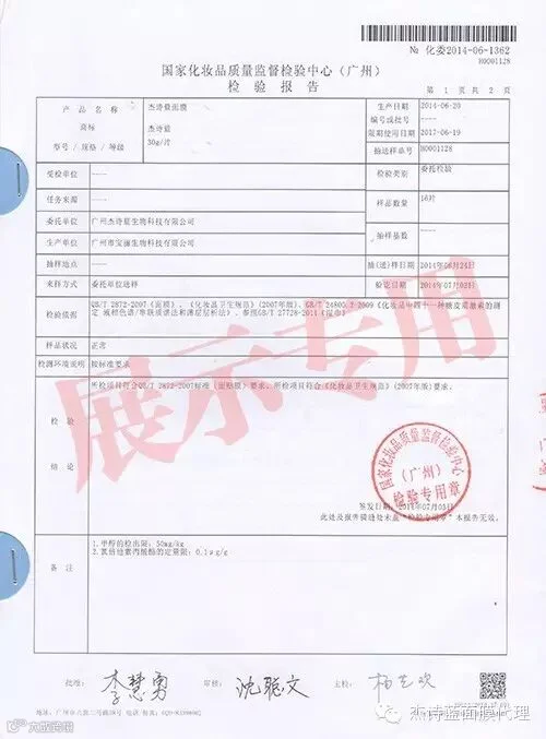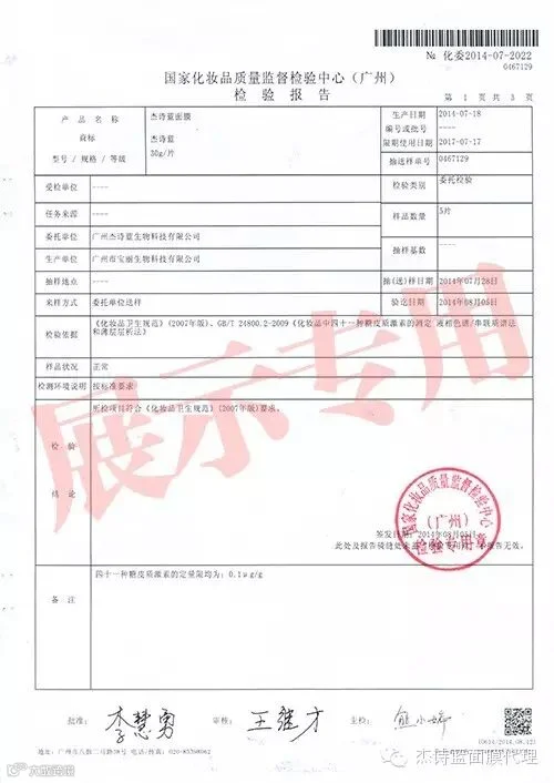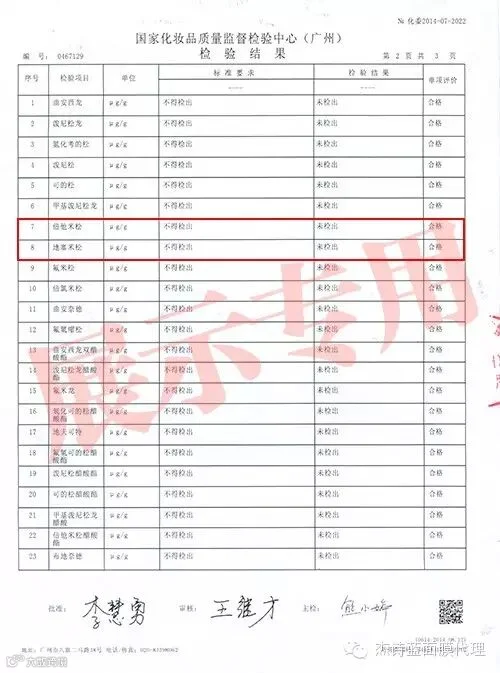 杰诗蓝品牌面膜2014年6月和7月的检测报告,这是对杰诗蓝第一批面膜的检测。报告是由国家化妆品质量监督检测中心(广州)发布。报告中表明:包括“氯陪他索丙酸脂”在内的化妆品中四十一种糖皮质激素的测定均为“未检出”。所有成份检测均为“合格”。