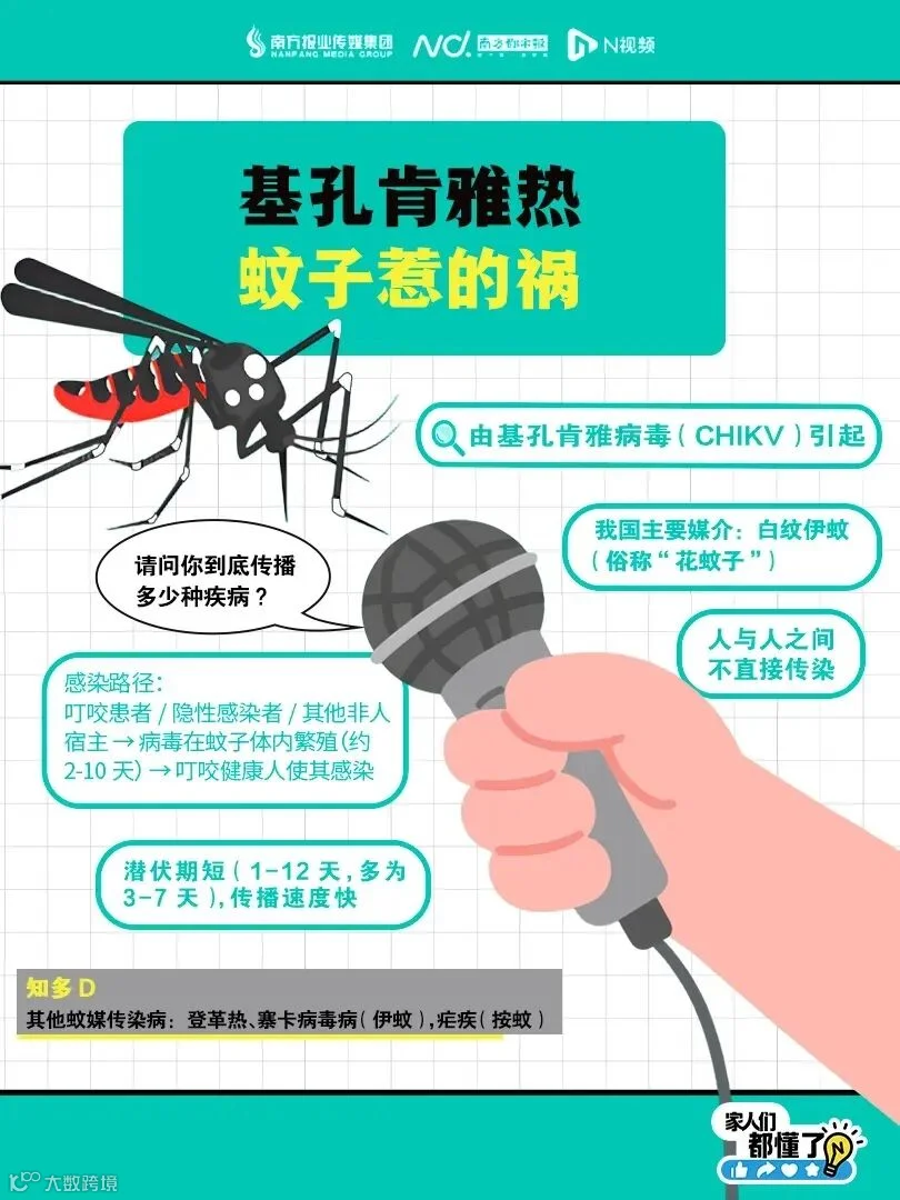 想知道基孔肯雅热咋传播?看这!它由基孔肯雅病毒(CHIKV)引起,咱国内主要靠白纹伊蚊(花蚊子)传播,病毒在蚊子体内繁殖后叮咬健康人致病,人与人可不直接传,还得防着蚊子传播的其他疾病呢~