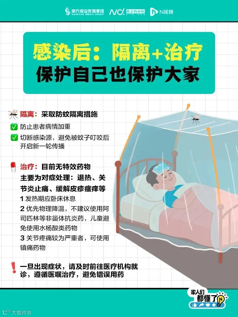 万一感染基孔肯雅热,别慌!先防蚊隔离,切断传播链、防病情加重;治疗没特效药,主要对症退热、止痛、止痒。发热期卧床,优先物理降温,关节痛重可镇痛,出现症状快就医,听医生的准没错!