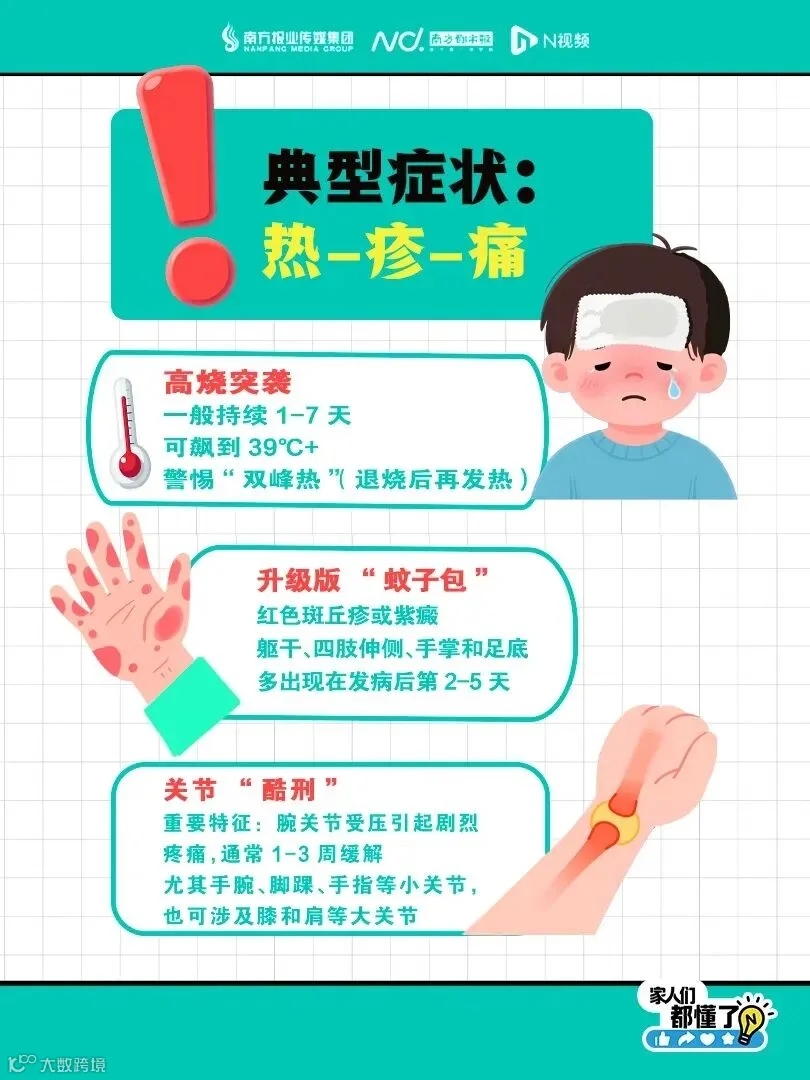 基孔肯雅热一来,“热 - 疹 - 痛” 三连击!高烧突袭,可能持续 1 - 7 天还飙到 39℃ + ,小心 “双峰热”;发病 2 - 5 天出升级版 “蚊子包” ;关节更是遭罪,腕关节受压剧痛,小大关节都可能被波及,这些信号别忽视!
