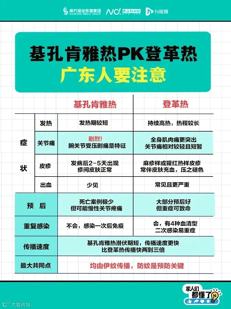 各位同事们注意!基孔肯雅热和登革热,同由伊蚊传播,症状、预后等大不同。基孔肯雅热发热期短、关节痛剧烈,登革热持续高热、肌肉痛突出;前者感染一次免疫,后者二次感染易重症,认清区别好防护!