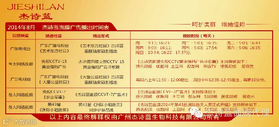 如此众多强势传播媒体、频道播放,杰诗蓝面膜凭借短、快、精、活的独特营销智慧!迅速抢占了广告舆论阵地的制高点,再配合全网联播的庞大资源,现正全方位打造,杰诗蓝面膜资讯的权威发布时尚圈。