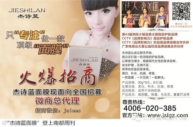 随着杰诗蓝面膜品牌的迅速发展与崛起,如今杰诗蓝面膜的绚丽广告,已经无可争议的成为都市生活圈一道靓丽的风景线。