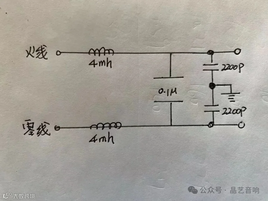 如果市电污染较严重的地区,例如:杂讯频率10K - 100K,需要考虑增加电感的过滤。不过电感的加入,是会对最终声音产生不同的影响的。电感的加入,会带来功率损耗,肌肤效应,密度一致性等等一系列的问题,主要体现在,如果电感Q值过高,听感上频率不均,高低端都会收窄,而中音变多。Q值过低,损耗又会较大,出现限流。 因此,对于100K - 1M 的杂波, 还是不加入电感为宜。对于10K -100K的杂波,因为污染较为严重,加入电感的正面作用大于反面。此时注意,电感的Q值(100hz)个人测试以1.7左右为宜,不能偏得太高。电感必须采用空气芯电感,不要带磁性。同时,如果在大电流的功放使用,电感的允许电流量必须考虑。 总体来说,一般都不建议加入电感的措施处理市电。一些小电流的器材,又对交流电杂讯敏感的,加入电感的措施会比较常见。例如:CD机。下图是一个典型的CD机内的电源处理措施。