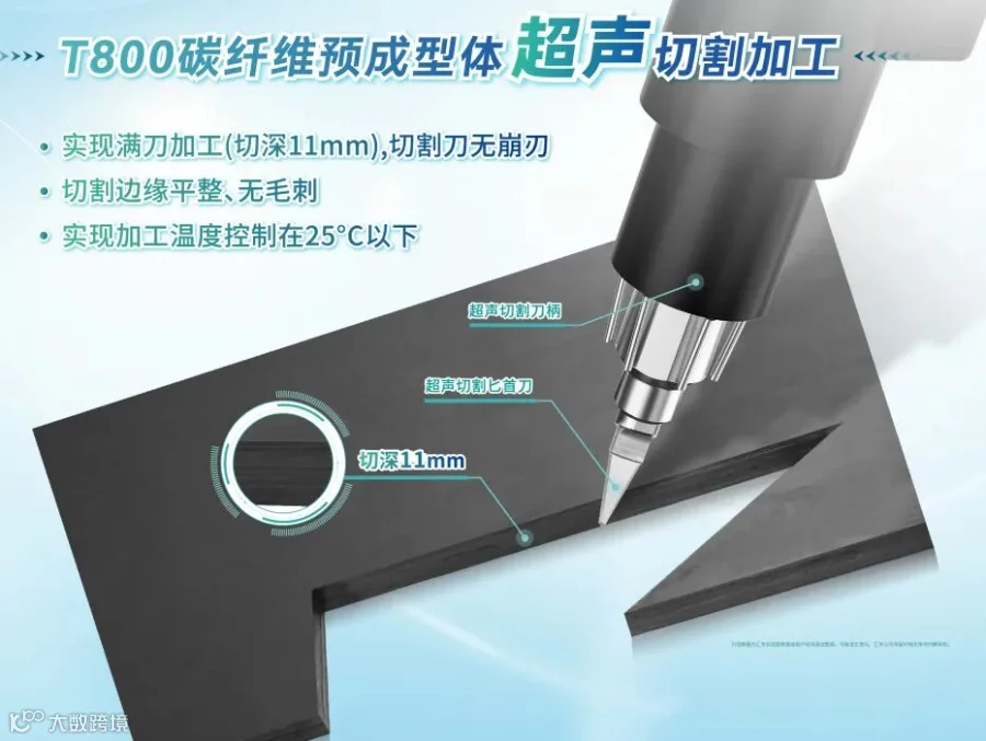 例如,在碳纤维预成型体切割加工中,传统方案加工刀具易崩刃,边缘不平整,且加工效率低;采用汇专复材超声切割龙门加工中心MCM3020C-5AXIS搭配超声切割加工技术、低温冷风冷却技术、超声切割匕首刀的组合方案,能够实现满刀加工,切深达11mm,且切割边缘平整、无毛刺,加工温度可控制在25°C以下。