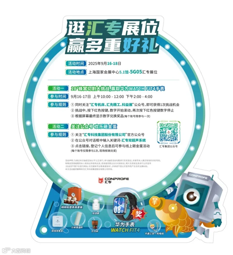 展会期间,汇专还特别设置了“18°蜂窝切割大挑战”“欢乐砸金蛋”等互动游戏,以趣味性竞技形式帮助观众更好理解汇专超声加工技术在蜂窝材料切割的应用优势,参与观众有机会赢取华为WATCH FIT4手表、柿柿如意茶具套装、充电宝、保温杯、加湿器等精美礼品。