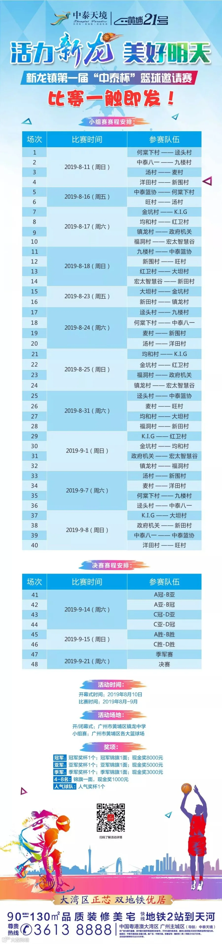 活力新龙 美好明天——第一届“中泰杯”篮球邀请赛火热来袭!作为原九龙镇规模最大的篮球赛,更是历年来奖金最多、报名队伍最多、比赛场次最多的。在这个盛夏,让我们一起见证热血男儿们洪荒之力的爆发,为他们的速度与激情加油喝彩!
