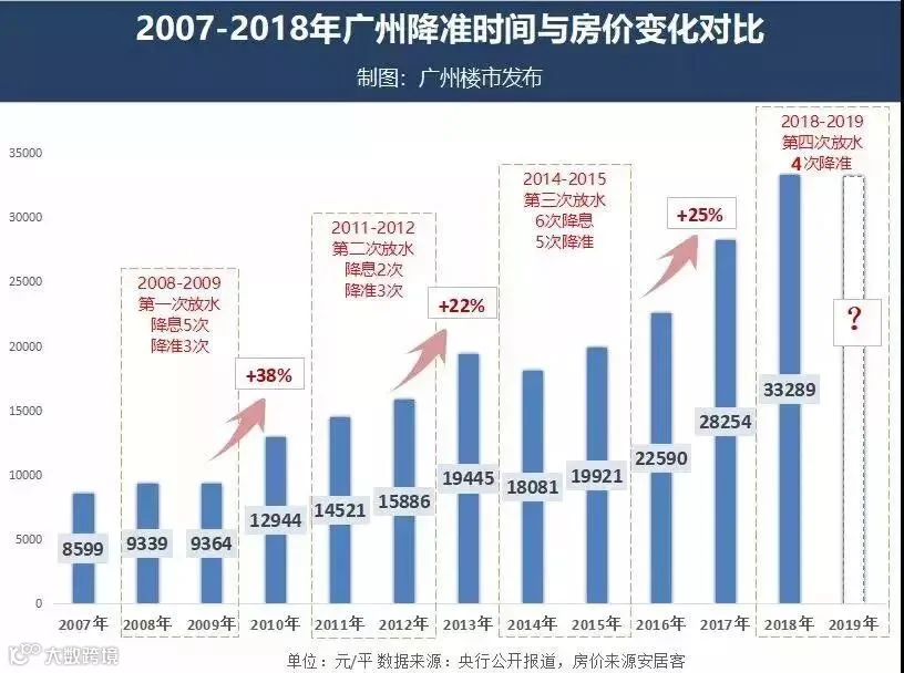 结合10年来房价的变化(以广州为例),可以大致看出,央行连续降准的时间段,刚好是房价阶段性上涨的前夕。以往的降准,带来的影响是房价的上涨。