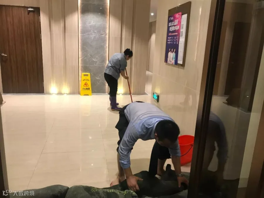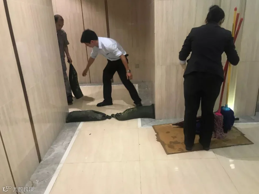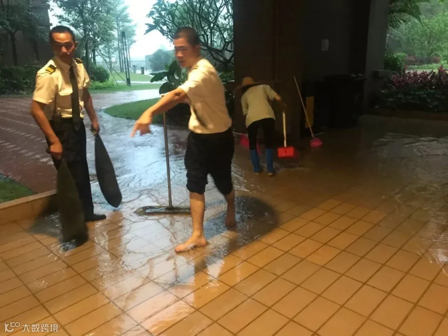 “ 各岗位工作人员,第一时间走向园区,清理路面、地库、天台等积水。一一排除主干道、路灯、水景等地是否有电线外露,疏通下水井盖,谨防公共安全事故发生。