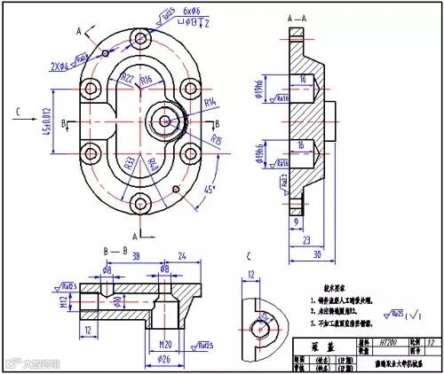 6. 填写标题栏,校核,完成零件工作图。泵盖的零件工作图,见图 3 。