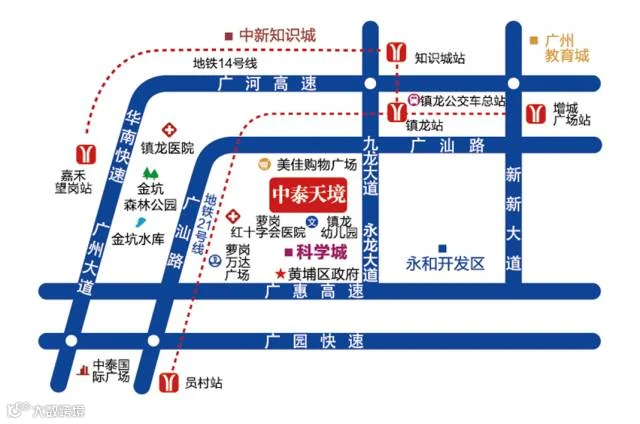 中泰天境花园附近有地铁14号线以及地铁21号线(广州首条快慢线,2017年开通),从中泰天境去往天河、珠江新城非常方便。