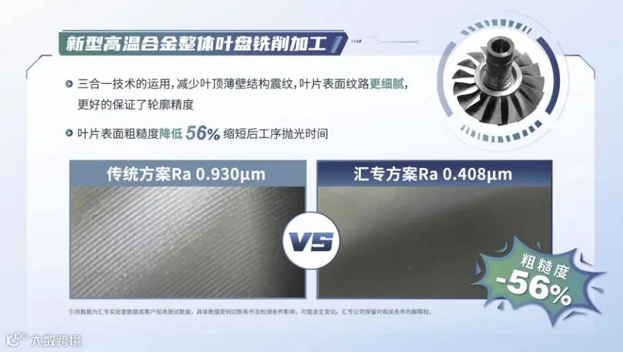 如在新型高温合金整体叶盘铣削加工案例中,汇专采用多用途超声绿色立式五轴联动加工中心MVA500-5AXIS,灵活搭载汇专自主研发的超声加工技术、超临界CO₂低温冷却技术和微量润滑冷却技术三项技术,有效减少了叶顶薄壁结构震纹,使叶片表面纹路更细腻,更好地保证了轮廓精度,并且叶片表面粗糙度降低56%,极大缩短后工序抛光时间。