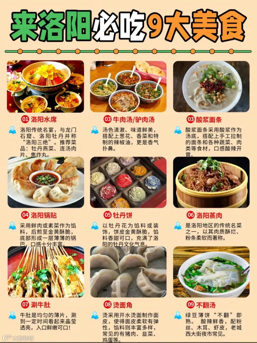•小吃:锅贴、浆面条、牡丹饼、不翻汤,洛邑古城、丽景门附近均可品尝到。
