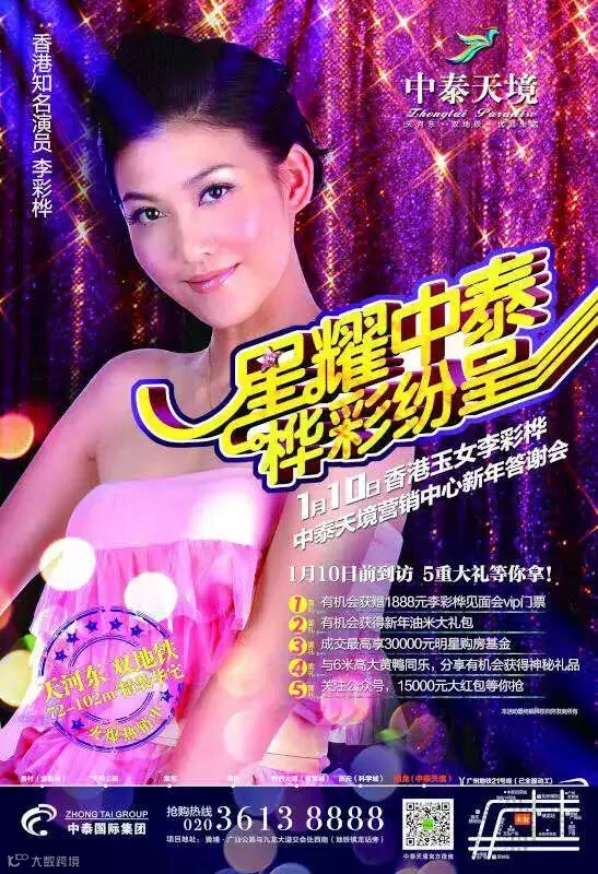 除了派红包福利,中泰天境更邀你与香港演技派女神亲密接触!1月10日,新晋影后李彩桦将现身中泰天境营销中心新年答谢会,面对面给各位业主和粉丝拜年!