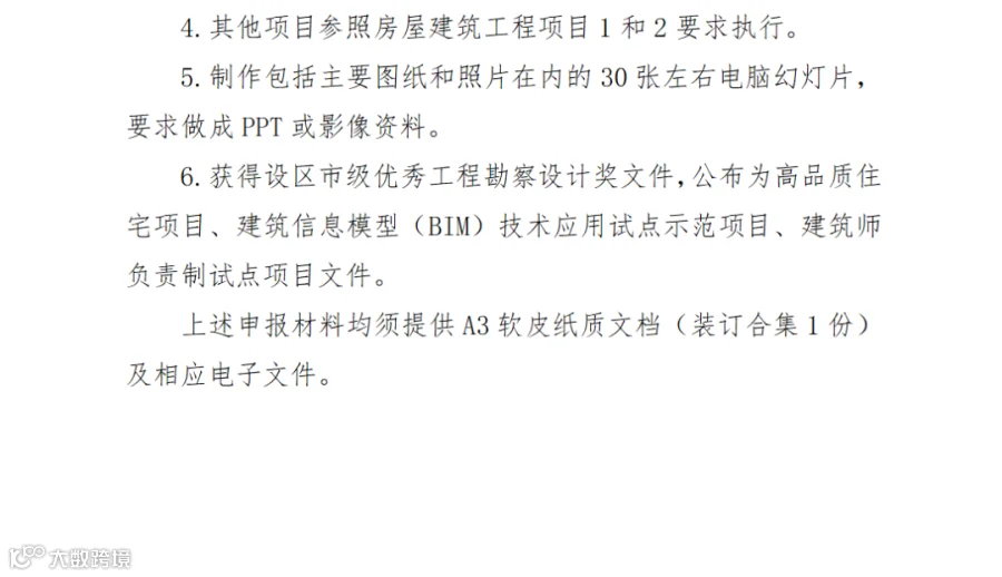 5.反映申报工程项目概况、工程建设特(难)点、建设过程质量管控措施、重要部位及隐蔽工程的质量检验情况、关键技术及科技进步、节能环保措施与成效、工程获奖、运维使用等情况的影像资料或有声PPT(5分钟以内)。