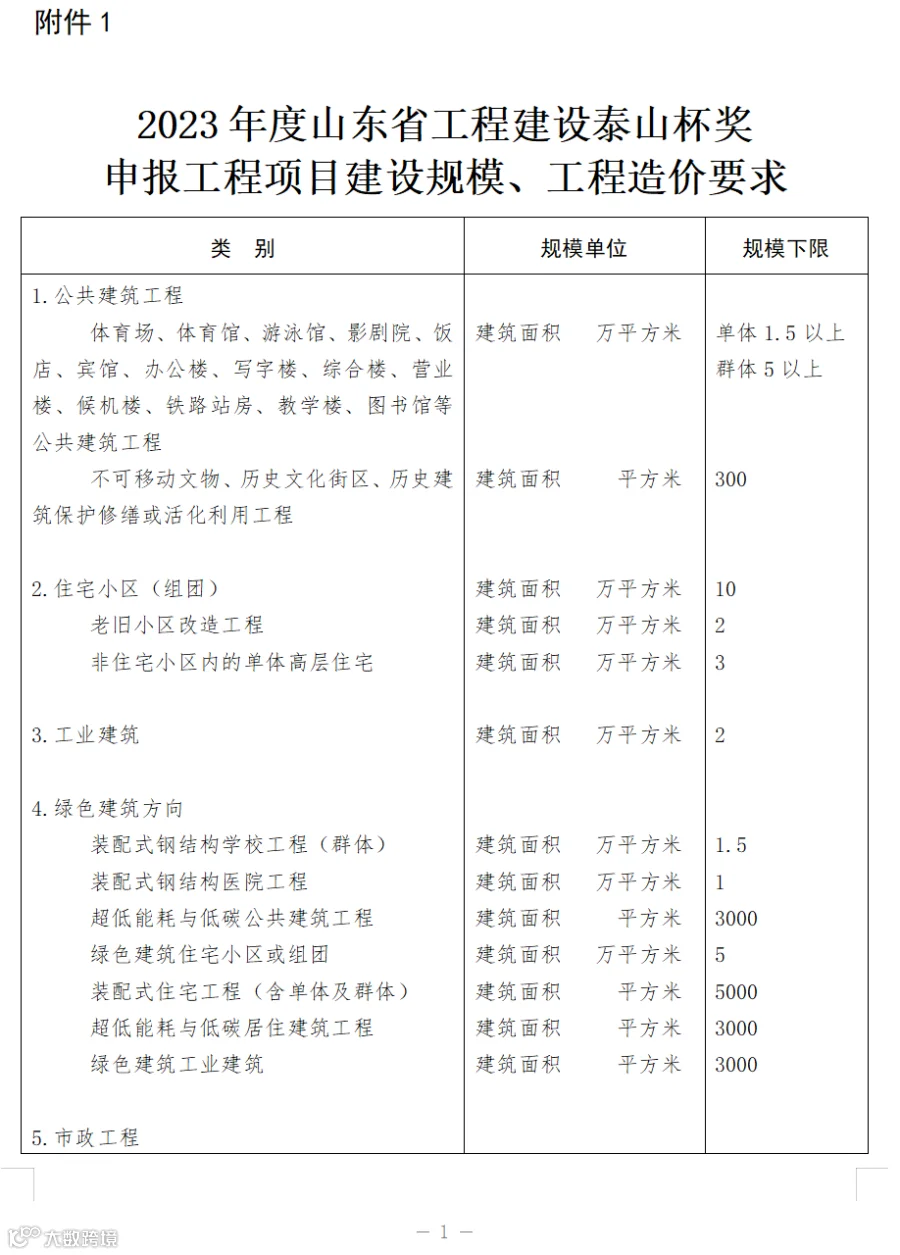 附件:1.2023年度山东省工程建设泰山杯奖申报工程项目建设规模、工程造价要求