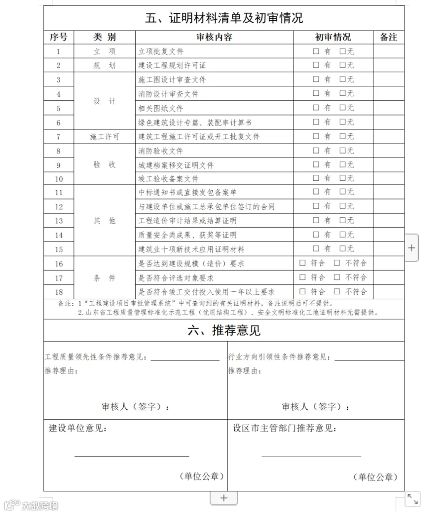3.申报所需证明材料PDF扫描版(按申报书中清单顺序)。“工程建设项目审批管理系统”中可查询到的有关证明材料,备注说明后可不提供。山东省优质结构工程、安全文明标准化工地证明材料无需提供。