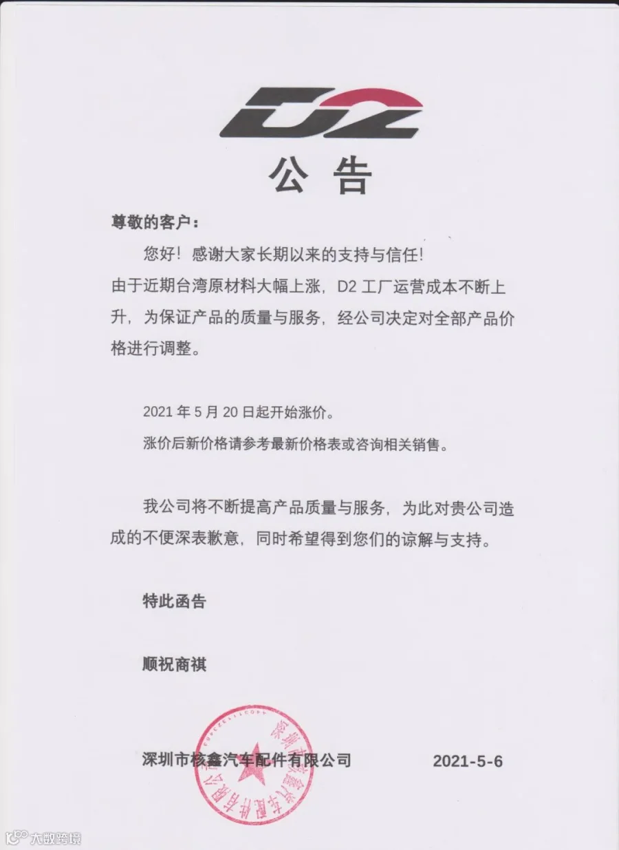 由于近期台湾原材料大幅上涨,D2工厂运营成本不断上升,为保证产品的质量与服务,经公司决定对全部产品价格进行调整。