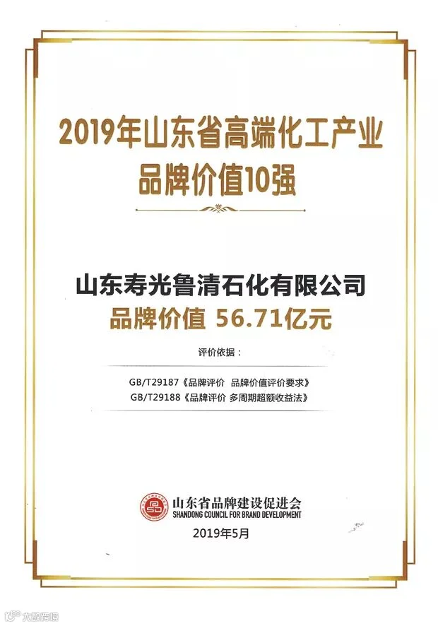 2019年“中国品牌日”品牌发布会暨品牌高端论坛5月10日在山东济南召开。会上发布了2019年山东省民营企业品牌价值100强榜单。鲁清石化以56.71亿元的价值位居山东省民营企业品牌价值榜第24位,山东省高端化工产业品牌价值10强。