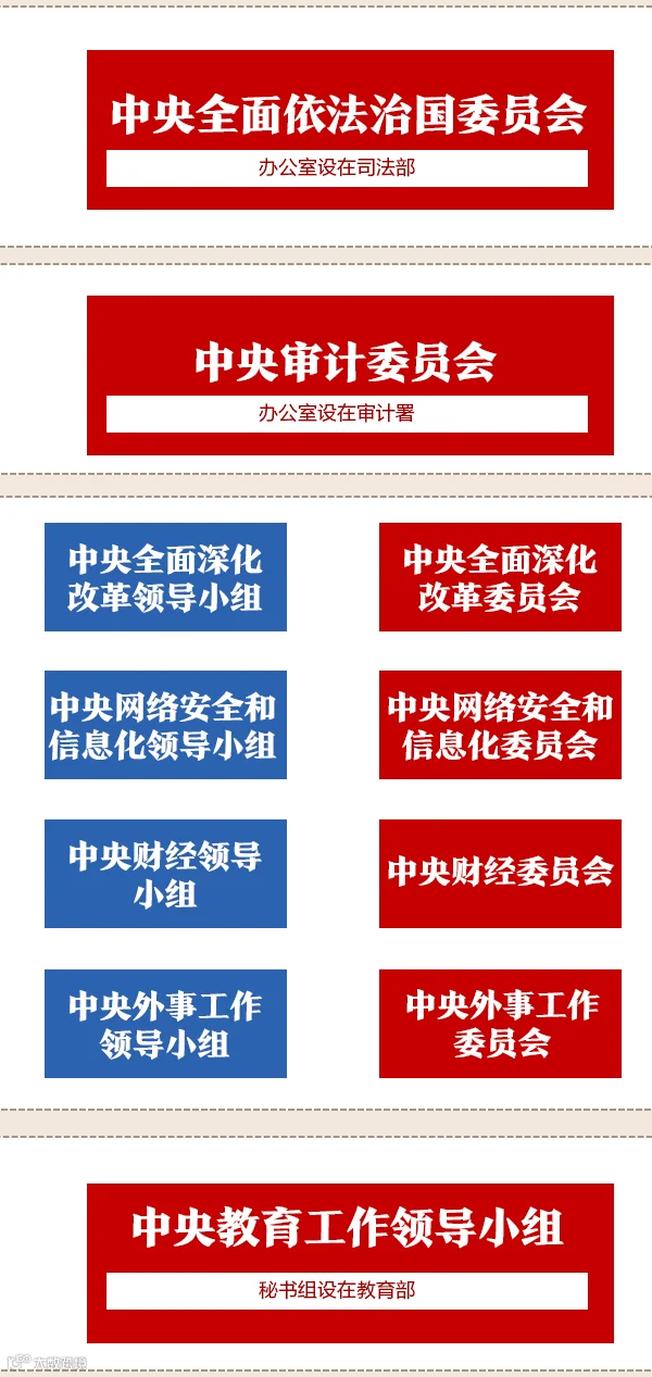 (二)组建中央全面依法治国委员会。全面依法治国是中国特色社会主义的本质要求和重要保障。为加强党中央对法治中国建设的集中统一领导,健全党领导全面依法治国的制度和工作机制,更好落实全面依法治国基本方略,组建中央全面依法治国委员会,负责全面依法治国的顶层设计、总体布局、统筹协调、整体推进、督促落实,作为党中央决策议事协调机构。