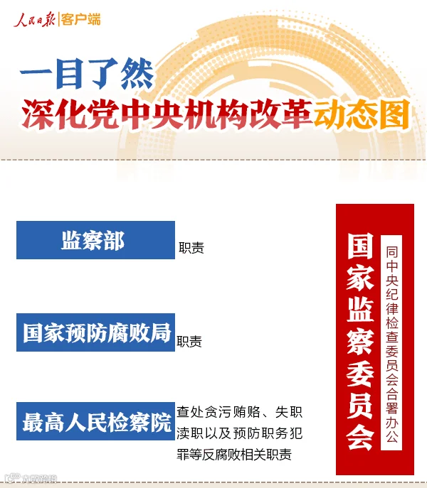 (一)组建国家监察委员会。为加强党对反腐败工作的集中统一领导,实现党内监督和国家机关监督、党的纪律检查和国家监察有机统一,实现对所有行使公权力的公职人员监察全覆盖,将监察部、国家预防腐败局的职责,最高人民检察院查处贪污贿赂、失职渎职以及预防职务犯罪等反腐败相关职责整合,组建国家监察委员会,同中央纪律检查委员会合署办公,履行纪检、监察两项职责,实行一套工作机构、两个机关名称。