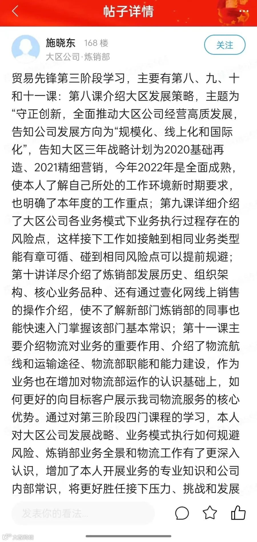回顾此次培训,大区公司产出了优质课件、优质组织者,同时也惊喜收获一批高分学习经验。通过个人分享,学员之间互相交流学习经验,加深对学习内容理解,从而强化学习成果,形成内容输入到知识产出的合理闭环。