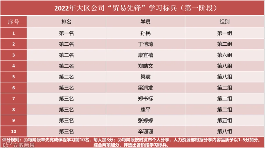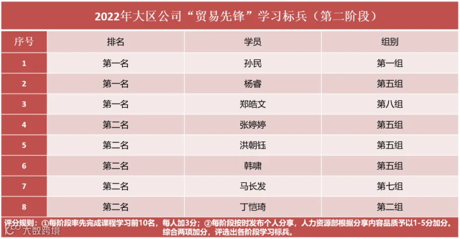 根据考核结果,“贸易先锋”第一期培养项目共计评选出5名优秀个人和1个优秀学习小组,并授予优秀学习小组“学习先锋团队”称号和优秀个人”优秀学员“称号,而培训尚未结束……